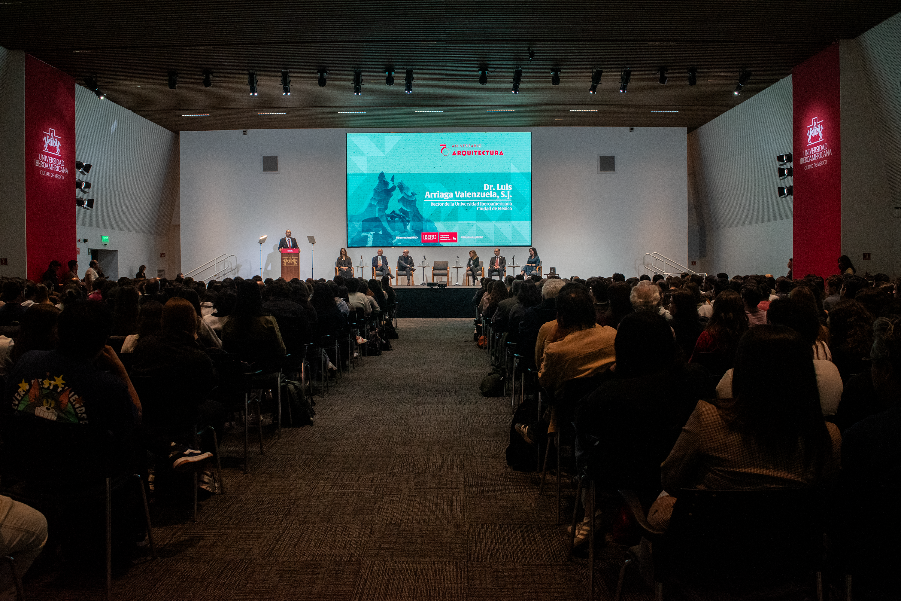 El Auditorio Sánchez Villaseñor se llenó el 27 de octubre para la ceremonia encabezada por el Dr. Luis Arriaga Valenzuela, Rector de la Universidad Iberoamericana; el Dr. Alejandro Anaya Muñoz, Vicerrector Académico; el Dr. Gamaliel Hernández Martínez, Director Divisional de Ingeniería, Ciencias y Arte (DiCAT); la Mtra. Ana María Olabuenaga, representante del Patronato de la IBERO (FICSAC); la Dra. Célida Gómez, Directora del Departamento de Arquitectura; la Dra. Jimena de Gortari, Coordinadora del mismo departamento; y el propio Arq. Francisco Serrano Cacho, Consejero del Patronato y egresado distinguido.