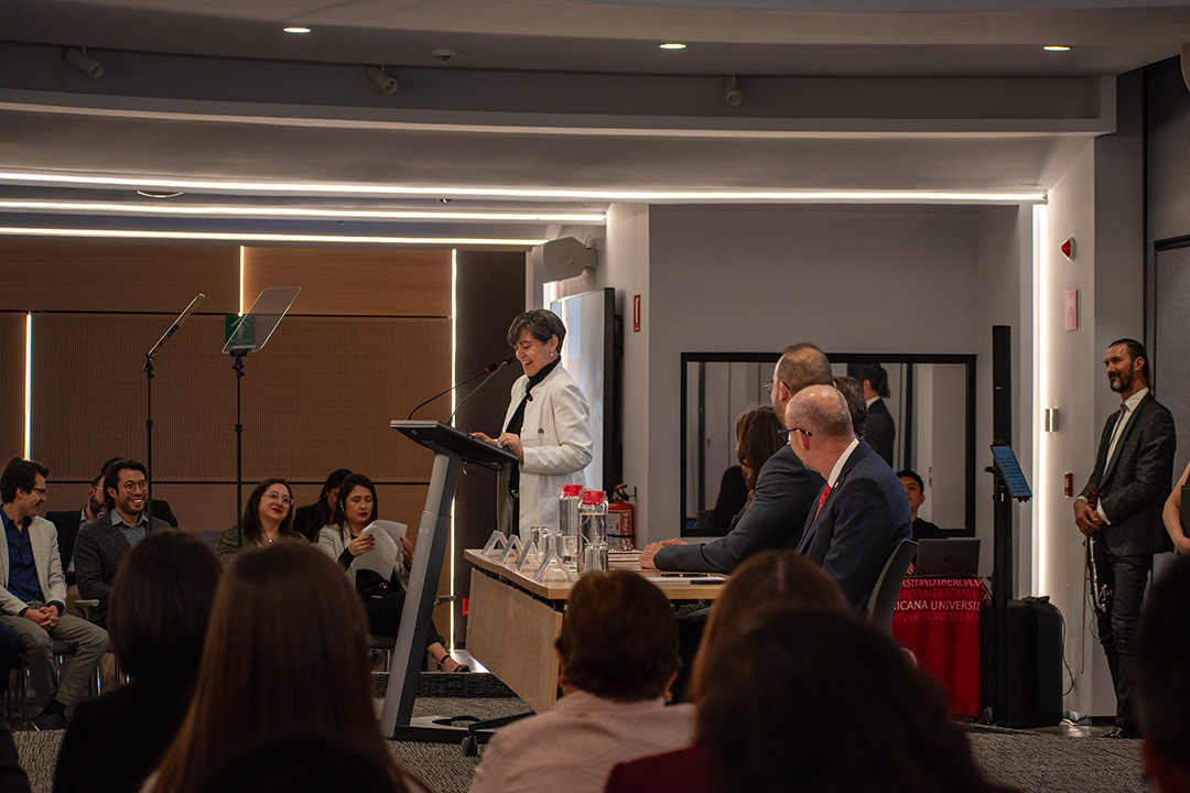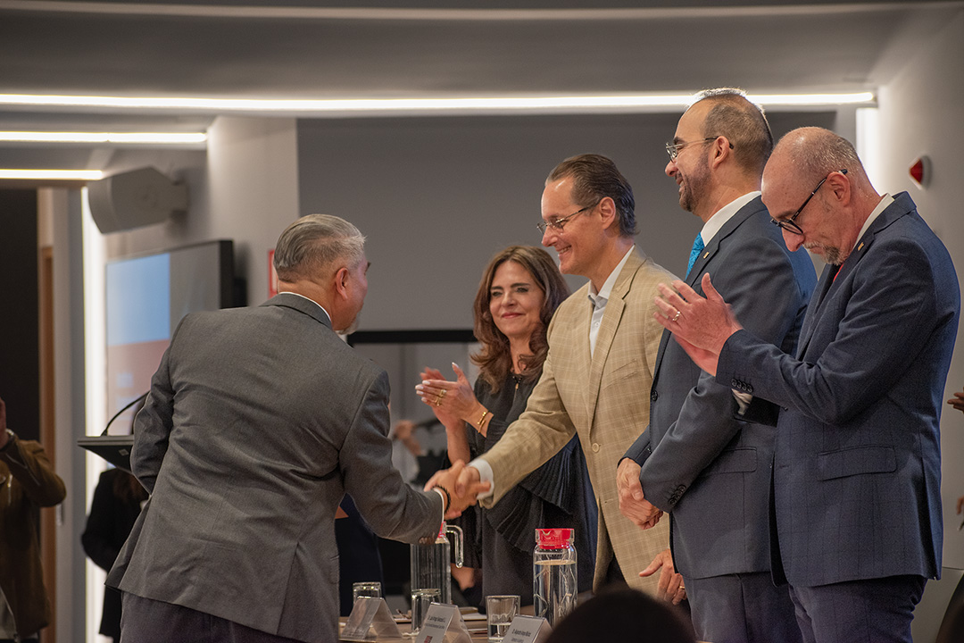 El presidium estuvo conformado por el Dr. Luis Arriaga Valenzuela, S. J., Rector de la Universidad Iberoamericana Ciudad de México; el Mtro. Bruno Cattori, presidente del Patronato de la IBERO; el Dr. Alejandro Anaya Muñoz, Vicerrector académico; y la Dra. Alicia Parra Carriedo, Directora de Investigación y Posgrado.